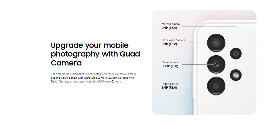 - eMMC 5.1MAIN CAMERAQuad50 MP, f/1.8, (wide), PDAF
